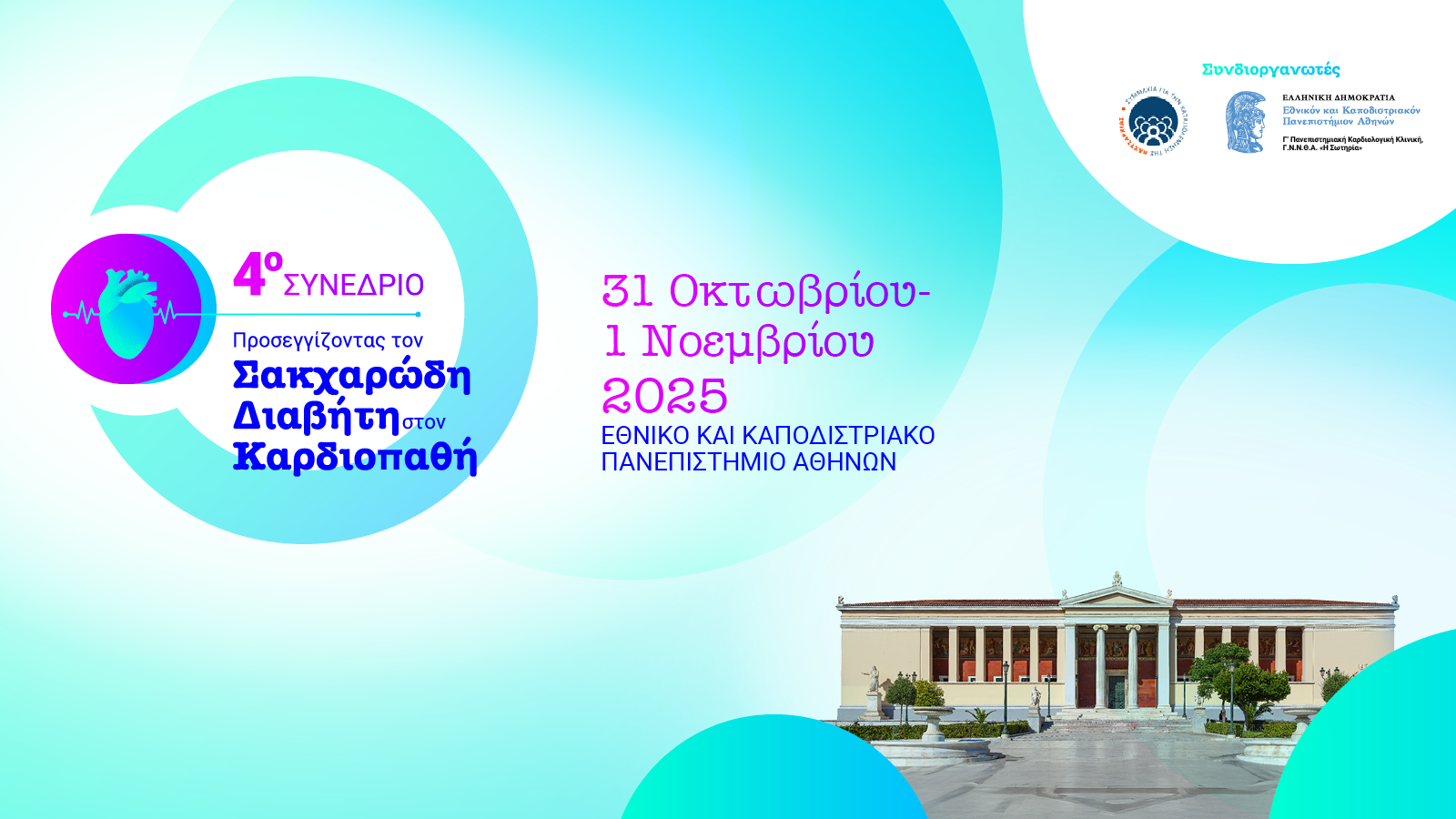Με ιδιαίτερη χαρά ανακοινώνουμε το 4ο Συνέδριο «Προσεγγίζοντας τον Σακχαρώδη Διαβήτη στον Καρδιοπαθή», που θα πραγματοποιηθεί στις 31 Οκτωβρίου και 1 Νοεμβρίου 2025 στο Κεντρικό Κτίριο (Προπύλαια) του Εθνικού και Καποδιστριακού Πανεπιστημίου Αθηνών.